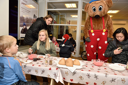 Rasmus Klup holdt øje med børnene i Sydbank - og for en gang skyld spiste han sig ikke mæt i pandekager, men honningkager.