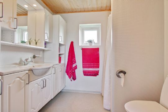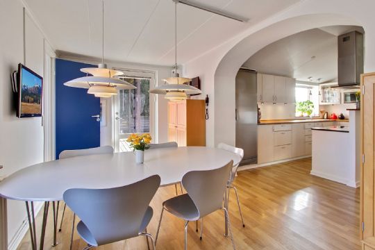 Boligen byder på to store stuer, et køkken-alrum, tre værelser, to badeværelser og en sauna. Fra begge stuer er der udgang til sydvendte terrasser.