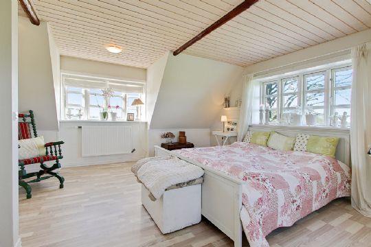 På 1. sal er rummeligt repos med separat kontorafdeling, loft til kip, synlige rustikke hanebånd, Velux vinduer med udsigt til marker og havkig. Der er stort soveværelse, som kan nemt opdeles til to værelser. Ud over to børneværelser er der badeværelse.
