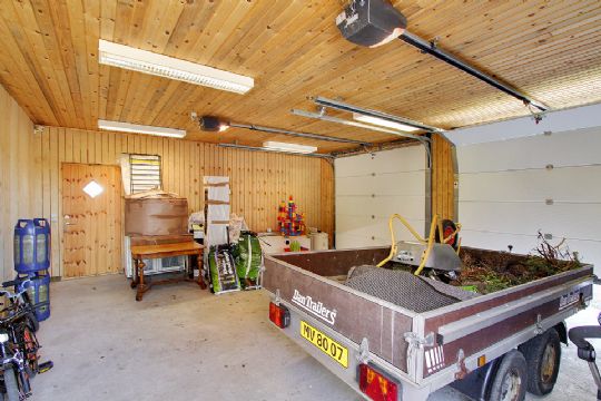 Der er dobbelt garage med elektrisk vippeport og separat isoleret værksted, redskabsskur og en skærvebelagt indkørsel til parkeringsareal.