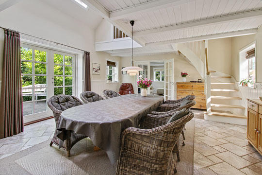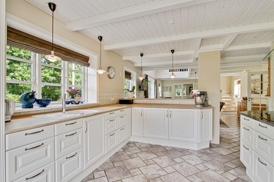 I køkken-alrummet er der åben etageadskillelse til førstesalen, lyse trægulve og fliser, brændeovn og masser af plads at indrette sig på. Svane-køkkenet er holdt i landlig stil og er ligeledes særdeles rummeligt. Hertil kommer en stue, et luksusbadeværelse med topersoners spabad, et bryggers samt et praktisk walk-in-closet. Fra bryggerset er der videre adgang til flere praktiske rum, der kan anvendes til opbevaring, hobbies og meget andet.