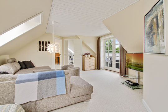 På førstesalen venter tre gode, store soveværelser og et kontor, endnu et badeværelse samt en dejlig stor stue med udgang til den hævede terrasse med udsigt over landskabet.