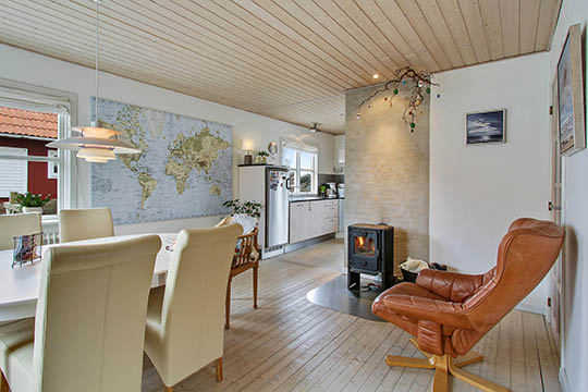 Opholdsmiljøet udgøres af et flot, åbent HTH-køkken med kvalitetshvidevarer og to sammenhængende stuer, hvor der er brændeovn i den ene. Boligen har desuden et rummeligt badeværelse.