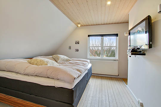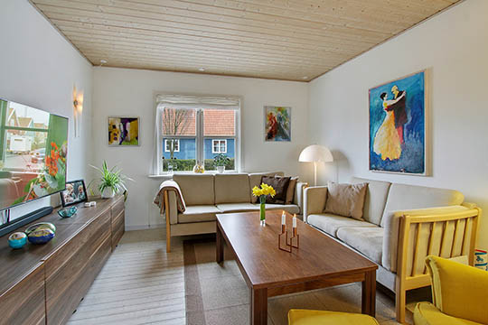 Huset er på 98 kvadratmeter fordelt på et to gode værelser på førstesalen og et stort, åbent opholdsmiljø i stueetagen med udgang til haven.