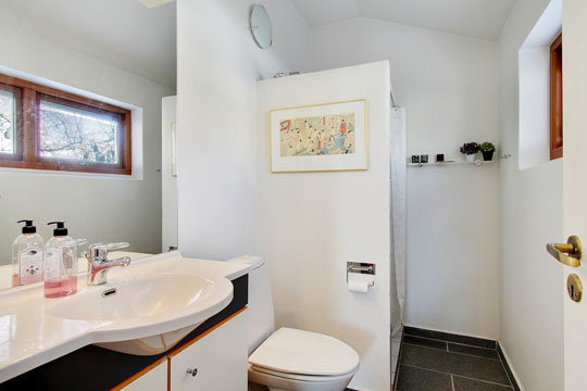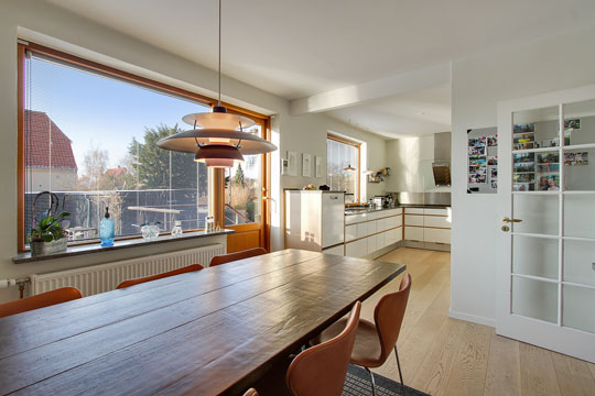 De mange kvadratmeter sikrer, at alle rum er behageligt store. Det eksemplificeres fint i den ekstra store opholdsstue. Rummet er delt i to og byder henholdsvis på en hyggelig pejsestue med opvarmet skifergulv, pejseindsats og et stort panoramavindue ud til haven. Den anden stue byder ligesom det meste af stueplan på et lækkert trægulv i Timberland Slotsplank. De brede planker fortsætter herfra ind i spisestuen og videre ud i gangen og skaber dermed en flot, strømlinet effekt.