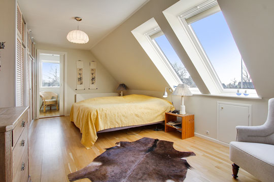 Der venter yderligere fire gode soveværelser på førstesalen. De to største værelser har begge eget walk-in-closet, og derudover byder etagen på to depotrum samt et badeværelse med havkig fra brusenichen. Flere af soveværelserne har store Velux-vippevinduer.
