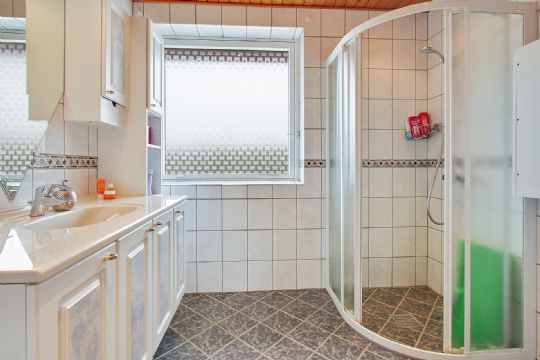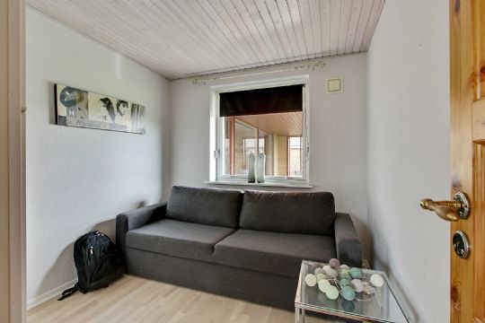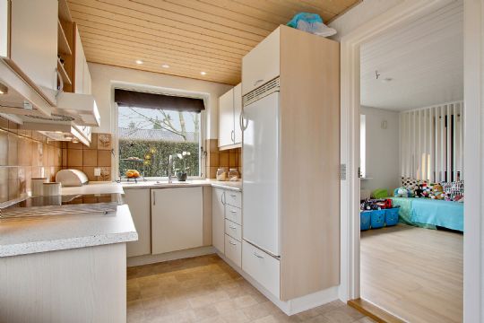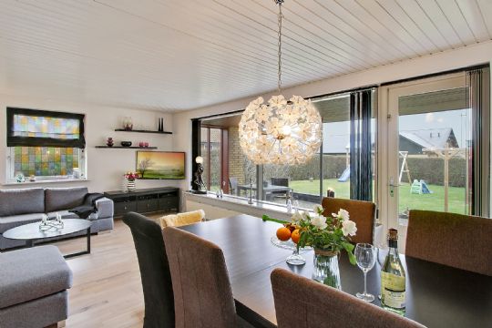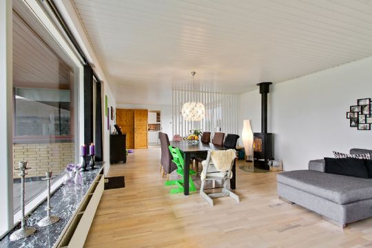 Desuden er der køkken med mulighed for at åbne op mod stuen, der er stor med brændeovn, parketgulv samt udgang til delvis overdækket terrasse.