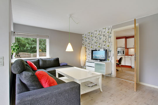 Grunden, der nærmest landligt beliggende med skov som den ene nabo og med udsigt til marker, har en hyggelig solgård samt med græsplæne.
