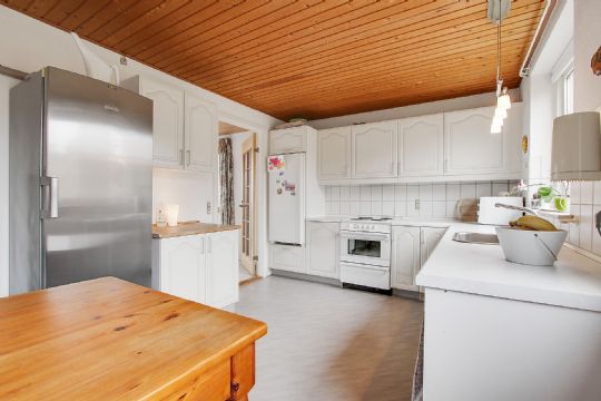 De 239 kvadratmeter er fordelt på to køkkener, tre stuer, fem værelser, to badeværelser og gæstetoilet.