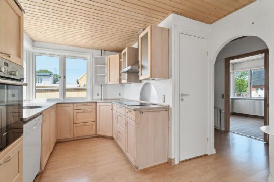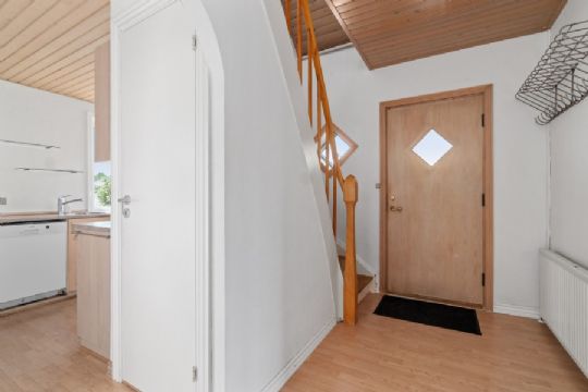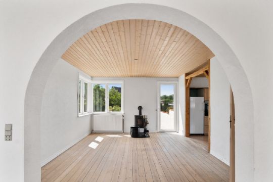 Ejendommen har et utroligt elegant udtryk med hvidmalet facade, halvvalmet tag og sortmalet sokkel og indendørs er gode opbevaringsforhold og store rum.