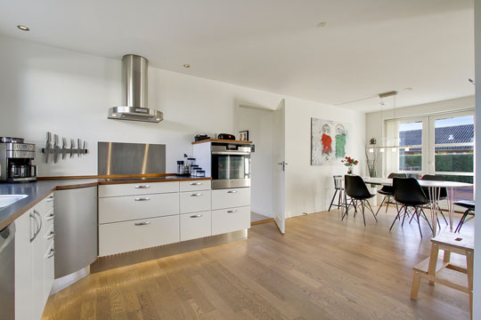 Midt i hjemmet er et stort opholdsområde med køkken-alrum og stue i åben forbindelse. Køkkenet har indlagt gulvvarme, og den store stue har brændeovn. Endelig rummer boligen et bryggers med plads til vaskefaciliteter.