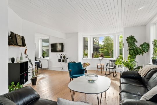 Især det herlige opholdsmiljø er værd at fremhæve. Her flyder stuen og køkkenet sammen i en U-form, og de store vinduespartier samt karnappen givet et lækkert lysindfald og sikrer på én og samme tid udsigten.
