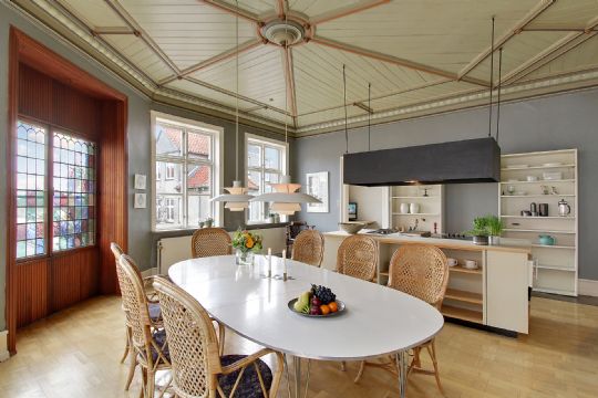 De mange kvadratmeter giver ikke bare god plads til hele familien, men åbner også for at drive et liberalt erhverv fra adressen. Dele af boligen kan med fordel indrettes som galleri, atelier eller tegnestue, alternativt ansøge om mulighed for at starte et lille hotel eller et Bed & Breakfast.