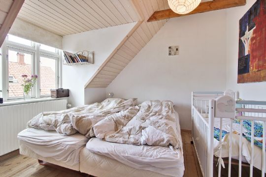 1. sal har afhøvlede gulve og loft til kip og er velisoleret. Her er trapperepos, soveværelse og børneværelse.