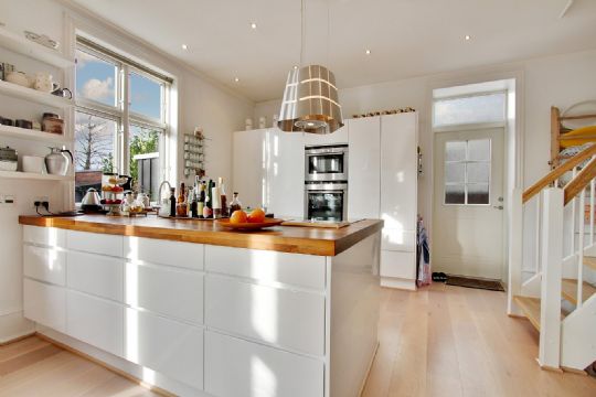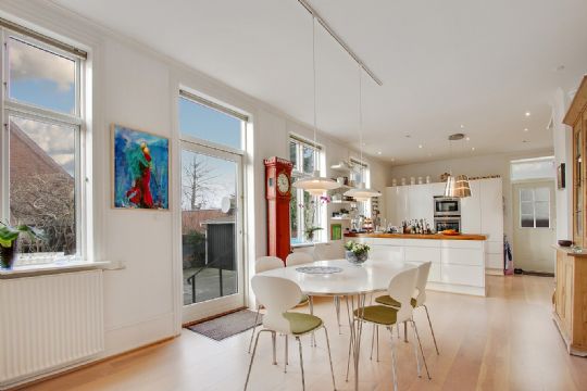 Der er et stort køkken-alrum med vinduer og terrassedør mod haven.