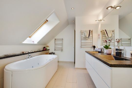 Boligen rummer desuden tre værelser samt badeværelse på hvert plan. På førstesalens badeværelse er der spabad.