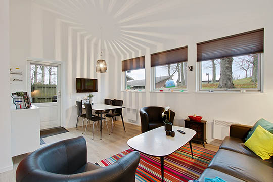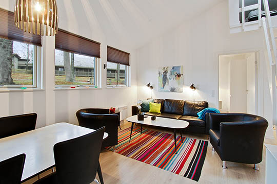 Stue har kiploft, hvilket åbner det op til de to hemse, hvoraf den største rummer to sovepladser, mens den mindre hems er hyggekrog.