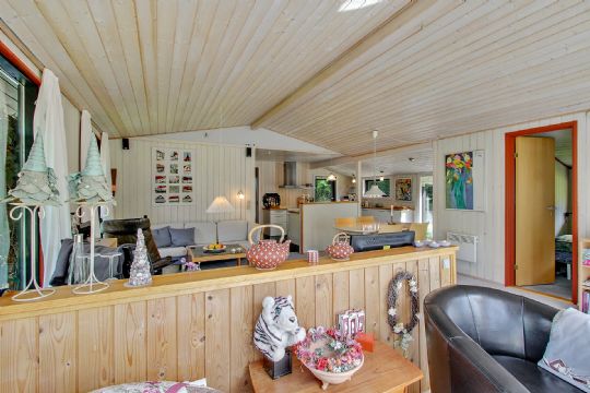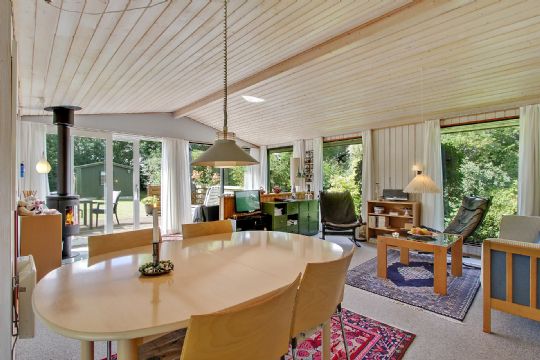 Sommerhuset indeholder blandt andet entre med garderobeafsnit, køkken åbent til opholdsstue med brændeovn og udgang til træterrasse mod syd samt haven.