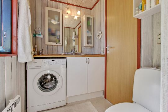 Badeværelse har toilet, bruseniche og vaskemaskine.