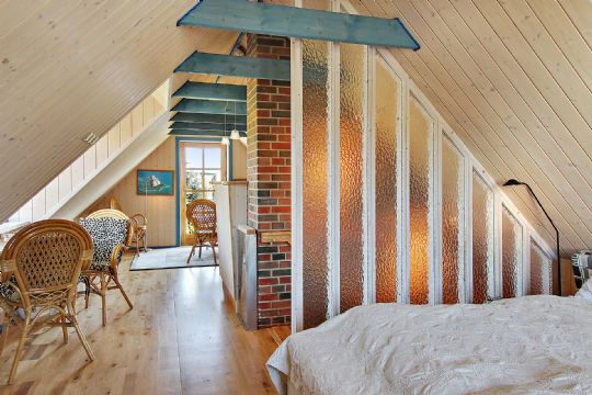 Sommerhuset hedder Perlen, og her blandes moderne komfort smagfuldt med sommercharme i en bolig, der blandt mange detaljer byder på loft til kip, synlige bjælker og et åbent køkken-stue miljø med brændeovn.
