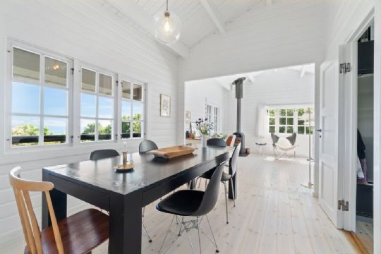 Huset indeholder køkken, alrum og stue med udgang til udsigtsterrassen ved brændeovnen. Der er tre værelser og et badeværelse med gulvvarme.