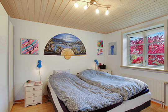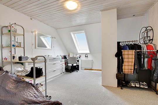 Fra entréen leder en trappe til første sal, hvor de to resterende værelser forbindes af en stor møblerbar repos med plads til fælles legerum og for eksempel en inspirerende hjemmearbejdsplads ved vindueskvisten.