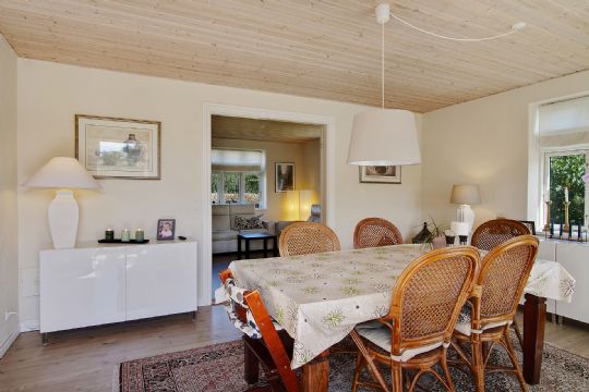 I hovedhuset er stort åbent køkken-alrum med opgang til 1. sal, spisestue med udgang til gårdsplads og opholdsstue.
