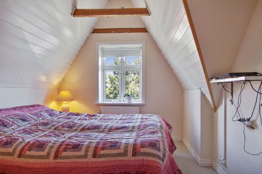 På 1. salen på sidebygningen er der kontor som er i åben forbindelse med stueplan og soveværelse med hævet niveau til sengen.