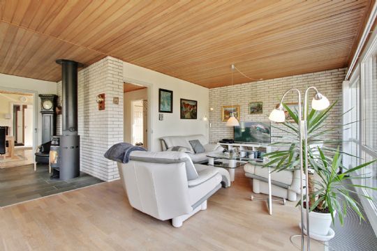 Huset har en vinkelstue med stort vinduesparti og brændeovn samt lyst trægulv.