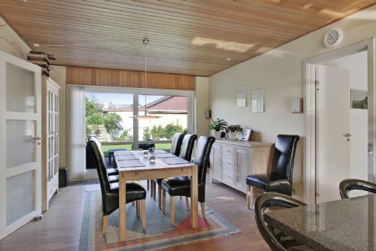 Boligens midte er dog køkken-alrummet ved siden af. Køkkenet byder på moderne, grebsfrie elementer med lækre bordplader i bornholmsk granit og hvidevarer af god kvalitet. Alrummet har plads til et godt, stort spisebord og udgang til haven.