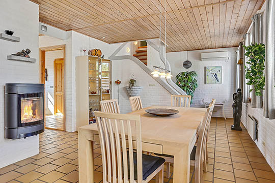 Huset byder på en lys entre. Badeværelse med bl.a. muret bruseniche og stort håndvaskarrangement. Rustikt køkken, som er nænsomt integreret og giver et brugbart areal. Køkkenet er i åbent plan til firefags spisestue med brændeovn og muret trappe til 1. sal.