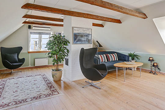 1. salen er særdeles godt udnyttet med seks kviste med havkig fra de tre kviste i henholdsvis stue, badeværelse og soveværelse mod vest.