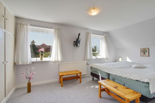 På 1. sal er repos, stort soveværelse og to værelser med skabe.