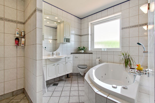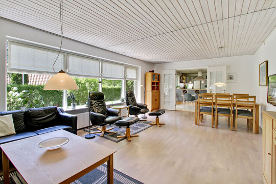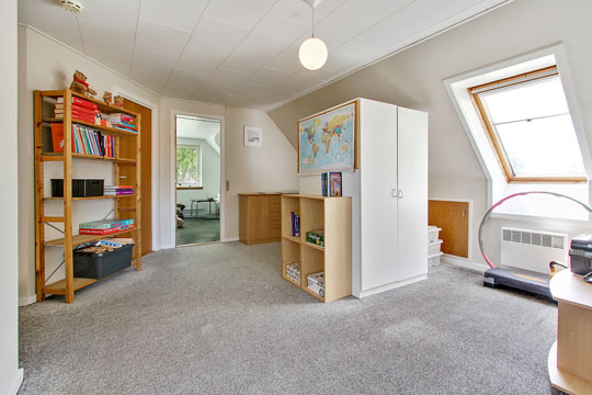 På 1. sal er stor tv-stue, toilet og fire værelser.