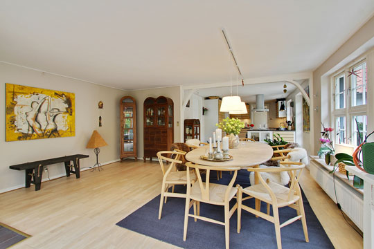 Huset på 235 kvadratmeter ligger tilbagetrukket fra vejen. Der er tale om en tolænget bygning fra 1841 med en behagelig atmosfære med synlige gamle bjælkekonstruktioner i begge plan.