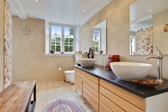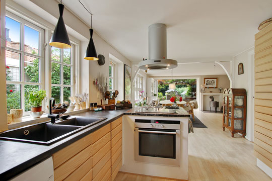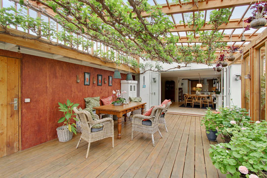 I stueplan er der brændeovn i begge de store opholdsstuer, og den ene af disse har glasfoldedøre, som åbner rummet helt op ud til et overdækket terrassemiljø med vinranker. Denne stue fungerer også som alrum, da den ligger i åben forbindelse med husets køkken.