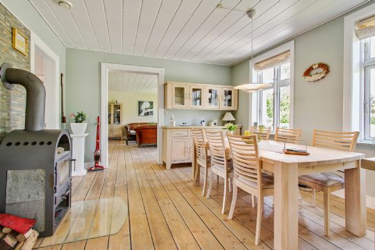 Ejendommen har gulvvarme i hele stueplan og indeholder blandt andet entre med trappe til 1. sal, spisestue med brændeovn og trægulv, opholdsstue med udgang til terrasse og haven, fjernsynsstue, spisekøkken med viktualiekælder og badeværelse.