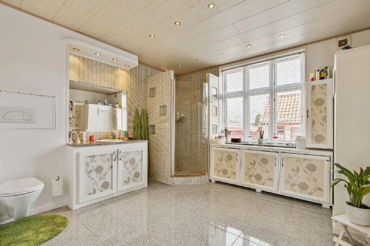 Herudover er der garage med elektrisk port, overdækket terrasse, lukket gårdsplads med fliseterrasse, lille baghave med køkkenhave og drivhus samt forhave med terrasse.