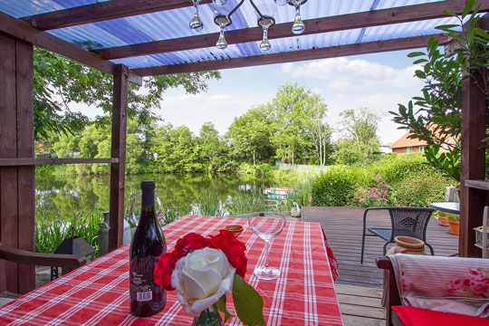 Haven er flot anlagt med flere hyggekroge og en lille trappe leder fra den ene terrasse ned til søen, hvor ejeren kan have en lille båd liggende.