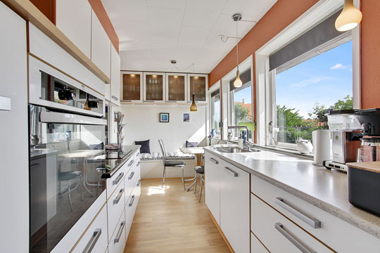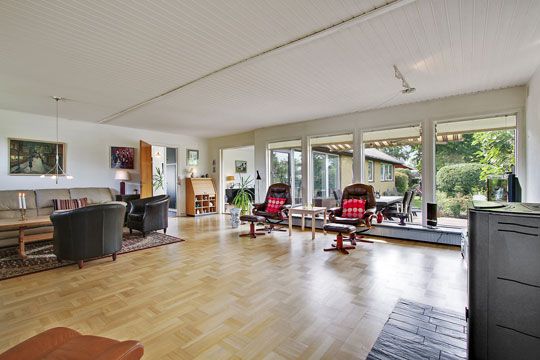 Derudover er der to stuer og et køkken i åben forbindelse. Der er også en udestue med synlige loftbjælker og brændeovn.