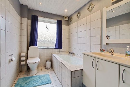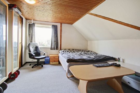 1. sal indeholder værelse med wallk in closet, to børneværelser, kontor, badeværelse med bruseniche og værelse med pulterrum samt indbyggede skabe.