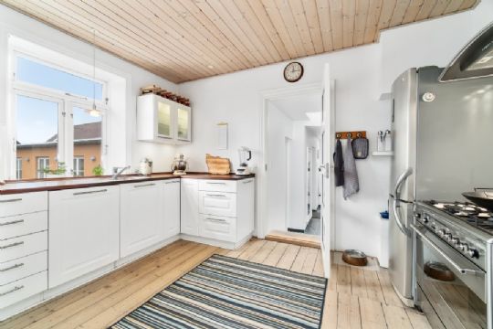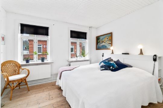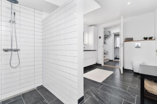 Stueetagen råder også over et rummeligt soveværelse, og i forskudt plan er et bryggers med adgang fra gaden samt to stilfulde badeværelser. Det er fra det forskudte plan adgang til det store værksted, der er blevet isoleret.
