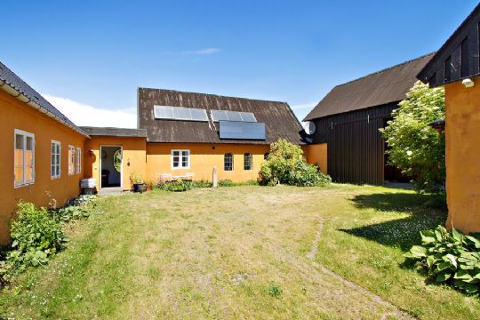 Der er gårdmiljø med rummelig vognport med plads til opbevaring af brænde, velholdt udlænge med værksted med pillefyr, magasinrum til træpillelager med indkøringssnegl samt stort lyst rum med loft i kip som kan danne rammen om fester.