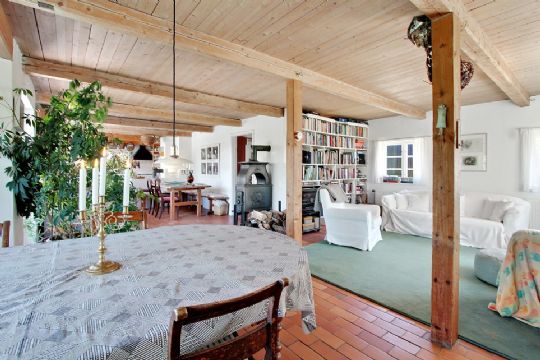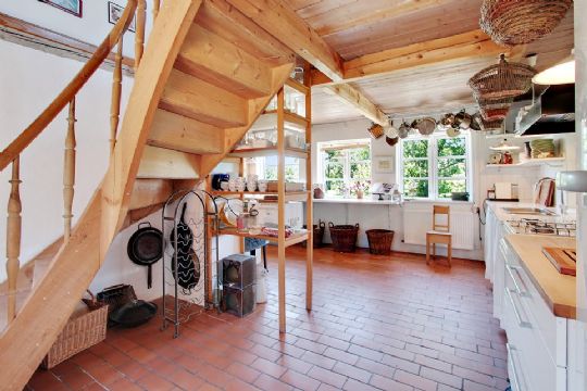 Ejendommen er praktisk indrettet, og hovedhuset der er vinkelbygget indeholder stor entré med klinkegulv som deler de to beboelsesafdelinger. Til venstre ligger det store landkøkken med trappe til 1.sal, spiseafdeling med brændeovn samt udgang til vestvendt terrasse, opholdsstue i åben forbindelse til køkken med karnap samt brændeovn og værelse.