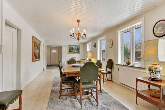 Indretningen fordelt på et stueplan og en førstesal giver plads til den store familie med flere flotte stuer, spisekøkken, fire gode værelser, to lyse badeværelser og masser af ekstra rum til opbevaring. Her er tilmed en vinkælder.