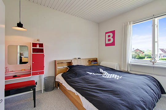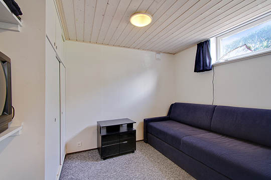 Huset indeholder entré med garderobe og nedgang til kælder, mindre badeværelse, opholdsstue med mulighed for brændeovn og udgang til solterrasse, soveværelse, værelse og spisekøkken.
