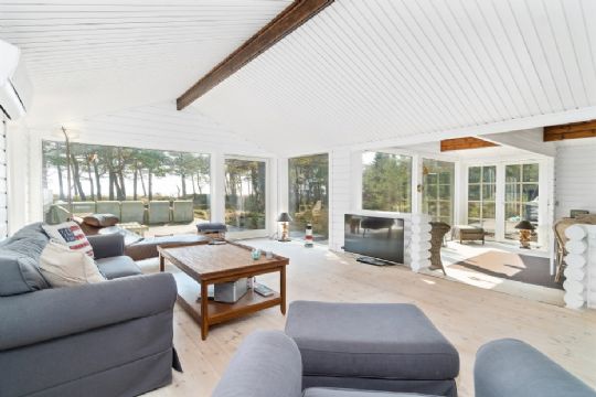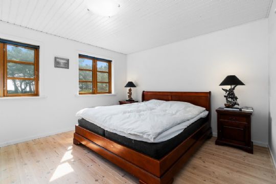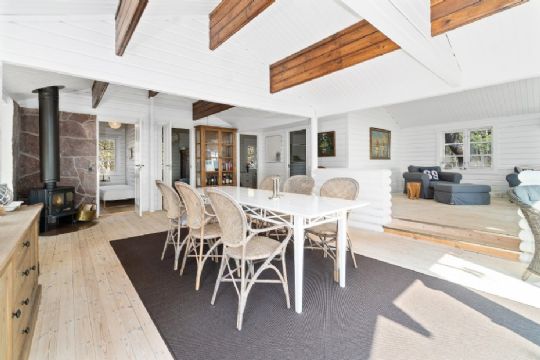 Huset seks værelser og to badeværelser. Der er køkken-alrum og stue i åben forbindelse. Herinde er loftet ført til kip med fritlagte bjælker i loftet, og så er her store vinduespartier, som giver en fænomenal panoramaudsigt over både hav og natur.