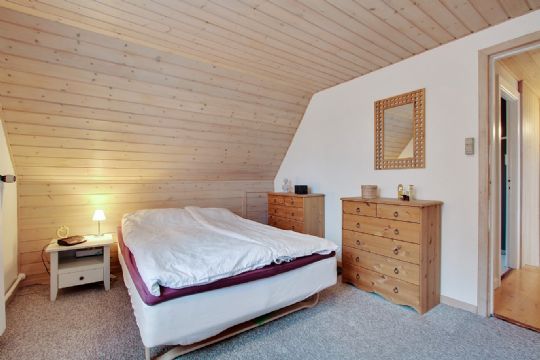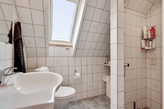 På 1. sal er nyere badeværelse med bruseniche samt gulvvarme, soveværelse med skabe og værelse.