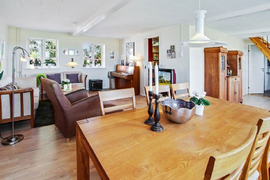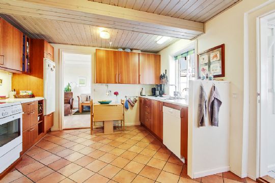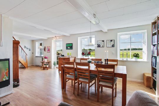 Ejendommen indeholder stort bryggers, viktualierum, spisekøkken, hovedentre, vinkelstue med trappe til 1. sal og udsigt over markerne samt udgang til sydvendt terrasse, gennemgangsværelse og soveværelse.