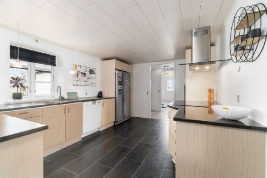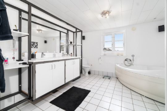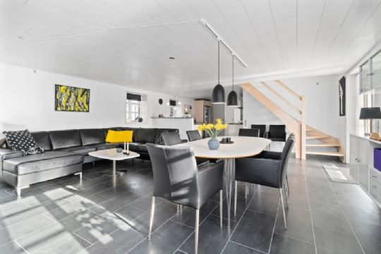 Centralt i boligen er et markant opholdsrum, der inkluderer stue og køkken i ét. Stueplanet afrundes af fire værelser, et badeværelse med spabad samt et bryggers.